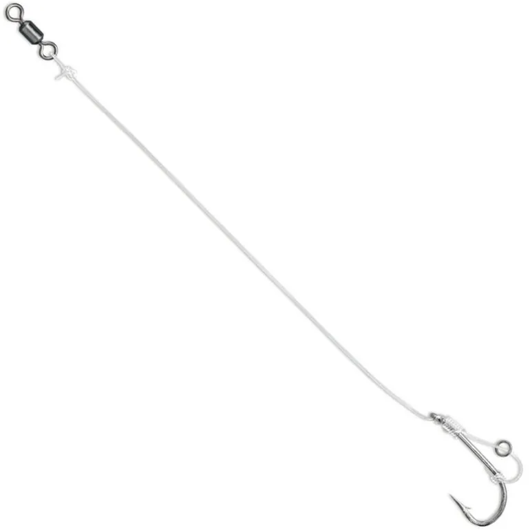 Bas de ligne technique très efficace. Fluorocarbone pour la discrétion et empêcher le rejet de l’appât, montage D-rig pour parfaire le piège. Ce montage ne s’emmêle pas lors des lancers à longue distance.