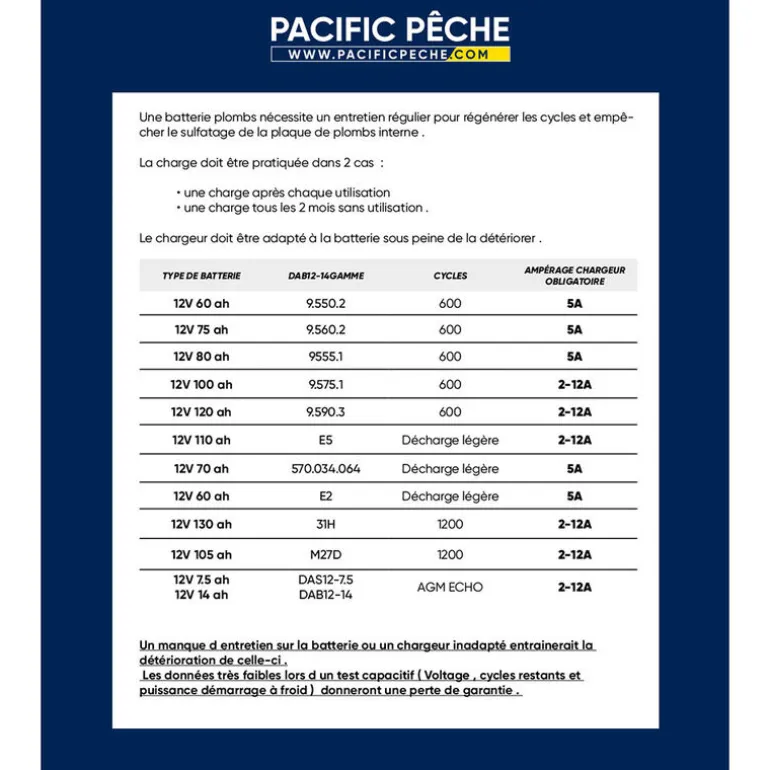 Conseil d’utilisation : Pour améliorer la durée de vie de votre batterie, il est recommandé de ne pas la décharger à plus de 80% de sa capacité et de la recharger au minimum une fois par mois et dans les 12 heures précédents chaque utilisation.