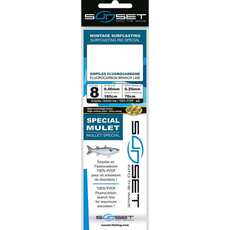 Les montages SURFCASTING RS COMPETITION SPECIAL MULET / FLUORO 3X70 sont munis d’un émerillon rolling sur le haut du corps de ligne permettant de les attacher rapidement à votre arraché. Une agrafe accroche plombs sur le bas du corps de ligne permet de changer rapidement le grammage des plombs en fonction des conditions de pêche.Munis de 3 empiles de 70cm en fluorocarbone montés sur des émerillons rolling bloqués entre 2 perles, d’une perle flottante sur les 2 empiles hautes pour décoller les appâts et d’hameçons ultra légers et ultra piquants en Black Nickel pour éviter la corrosion, les montages SURFCASTING RS COMPETITION SPECIAL MULET / FLUORO 3X70 vous permettront de de pratiquer les pêches fines de bordure et la pêche du mulet avec 1 à 3 vers demi dures par hameçon enfilés à l’aiguille.Ces montages possèdent des empiles en Fluorocarbone 100% PVDF ; totalement invisible sous l’eau offrant une approche ultra discrète pour les poissons les plus méfiants. Il évite également le vrillage dans les courants forts.Les montages SUNSET SURFCASTING RS COMPETITION sont montés avec des composants haut de gamme pour que vos parties de pêche soient une véritable réussite !D’une longueur totale de 180cm, les bas de ligne SUNSET SURFCASTING RS COMPETITION SPECIAL MULET / FLUORO 3X70 sont disponibles en hameçon numéro 8.
