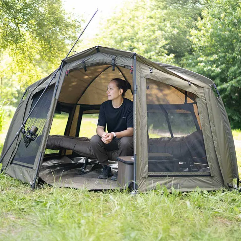 Il est livré avec 2 banksticks double serrage et dispose de raidisseurs télescopiques Ø19 mm avec double vis de serrage pour renforcer la rigidité. La porte modulable (ouverture par le bas ou mode boîte aux lettres) s’adapte aux conditions météo. Les fenêtres moustiquaires (latérales et arrière) avec fermeture zip + velcro assurent ventilation et protection contre les insectes. Enfin, le tapis de sol heavy duty en une seule partie est fixé par une fermeture éclair haute résistance pour un ensemble parfaitement étanche.