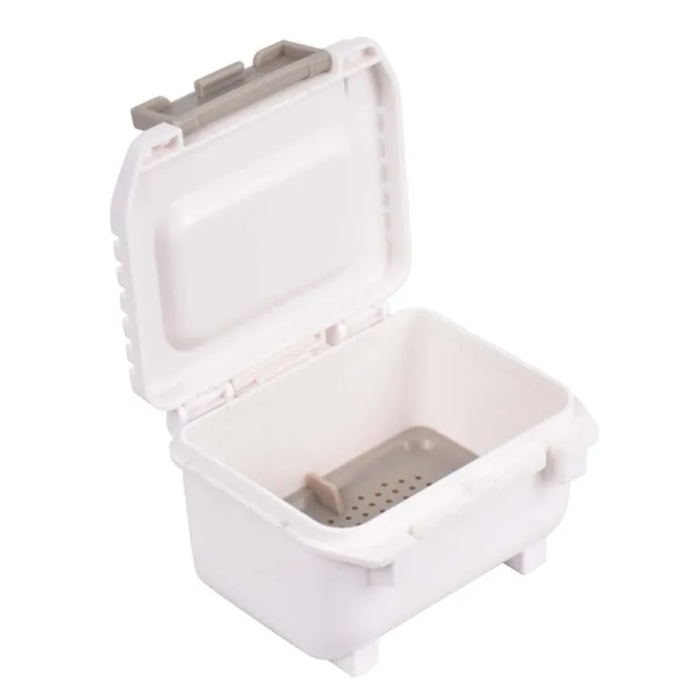 Boite à appât avec double fond perforé pour maintenir ses appâts au sec, se porte à la ceinture grâce à un clip, fermeture solide.