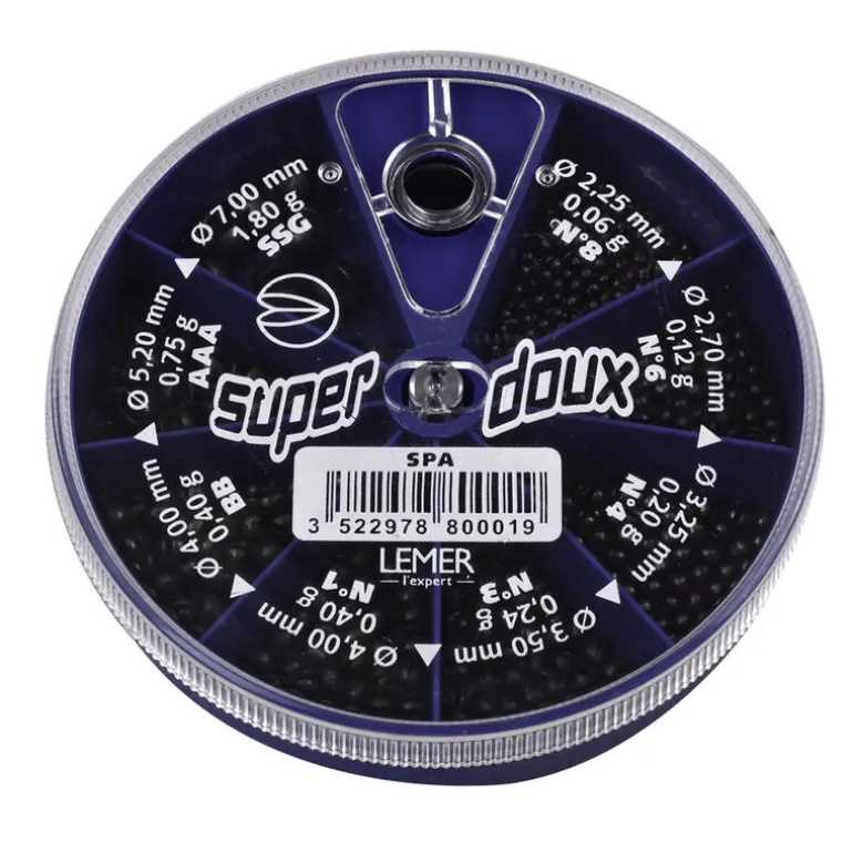 Tailles : SSG (1,80 g), AAA (0,75 g), BB (0,40 g), 1 (0,40 g), 3 (0,24 g), 4 (0,20 g), 6 (0,12 g) et 8 (0,06 g). Celles-ci conviennent mieux pour les pratiquants de pêche à l’anglaise.