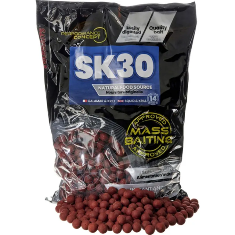 Formulée à partir de matières premières carnées de haute qualité reconnues pour leurs principes attractifs tels que: farines de poissons séchées à base température, extraits solubles de protéines de poissons, extraits marins, et associés à des composés attractifs solubles provenant du calamar ainsi que du krill, la « SK 30 » possède un profil en acides aminés ainsi qu’en acides gras permettant de la classer comme étant un appât indispensable dans la sélection de gros poissons sur un poste.