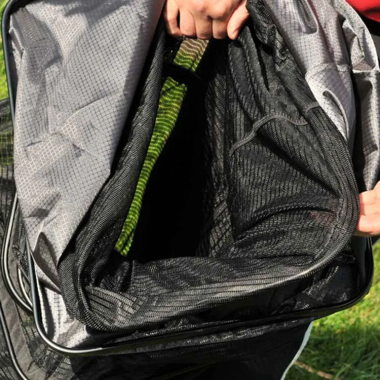 L’ouverture est grande afin de pouvoir y glisser votre tête d’épuisette et déposer les poissons délicatement et en toute sécurité. Elle possède aussi un pas de vis orientable que vous pouvez bloquer dans n’importe quel angle pour y fixer votre pique ou votre support bourriche. La toile de l’anneau supérieur est très solide et élimine tout risque d’accrochage de vos hameçons dans les mailles du filet. Les anneaux sont tous en aluminium plein pour que votre bourriche coule parfaitement lorsque vous la déployez, et pour qu’elle ne dérive pas en cas de courant. Le filet est aussi cousu à l’intérieur des anneaux, contrairement aux autres bourriches, pour éviter que la bourriche ne s’accroche au fond de l’eau. Les anneaux supérieurs sont plus grands pour faciliter le rangement et hisser les poissons sur la berge, et ainsi les garder en parfaites conditions. La bourriche pour la pêche au coup SILVER MATCH 2.50M est livrée avec un joli sac de transport étanche.