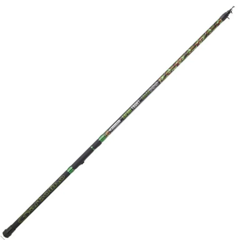 Canne truite téléréglabe et compacte. Puissance maximale de 30g. Bague réglabe Garbolino et porte moulinet à plaque métallique. Construction en carbone + composite. Finition CAMOU Safari.
