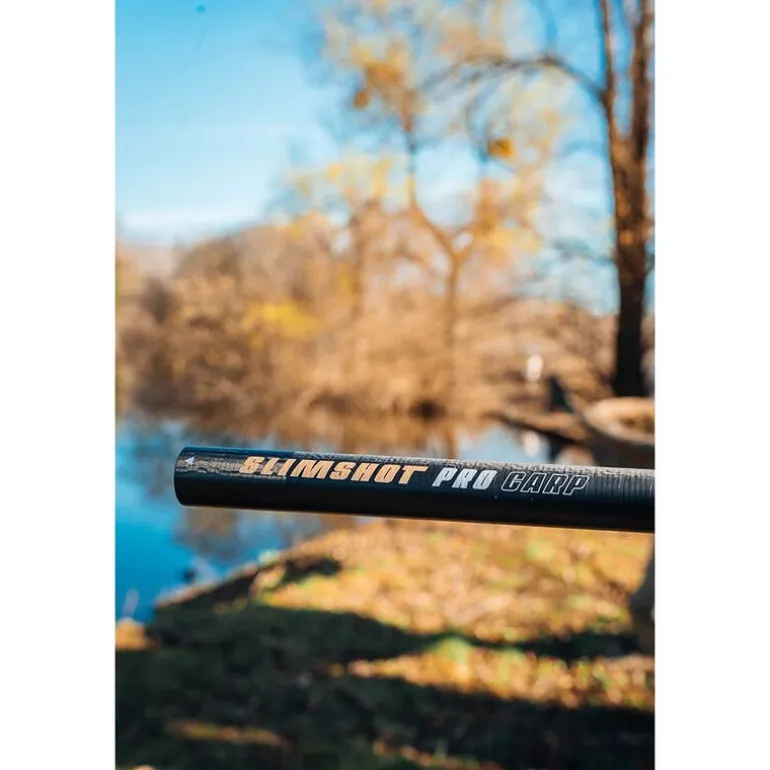 La canne SLIMSHOT PRO CARP est le modèle le plus abouti de la série SLIMSHOT dédiée à la pêche de la carpe au coup. D’une longueur de 11m, la SLIMSHOT PRO CARP 1100 est adaptée à la pêche des carpes at autres gros poissons, que ce soit en carpodrome ou en milieu naturel. Elle est plus légère et plus maniable que sa petite sœur la SLIMSHOT CARP. L’utilisation de nappes en carbone MI/HM lui confère une grosse réserve de puissance qui vous permettra de combattre les carpes dans les meilleures conditions. Elle est équipée d’origine d’un kit de 2 éléments pré-percé avec une bague céramique pour installer un élastique intérieur avec une sortie latérale de type « strippa », ce qui vous permettra de gérer facilement la tension de l’élastique lors de la mise à l’épuisette de vos poissons. Comme tous les modèles de cannes TEOS destinés à la pêche de la carpe au coup, le diamètre intérieur de sortie du scion est de