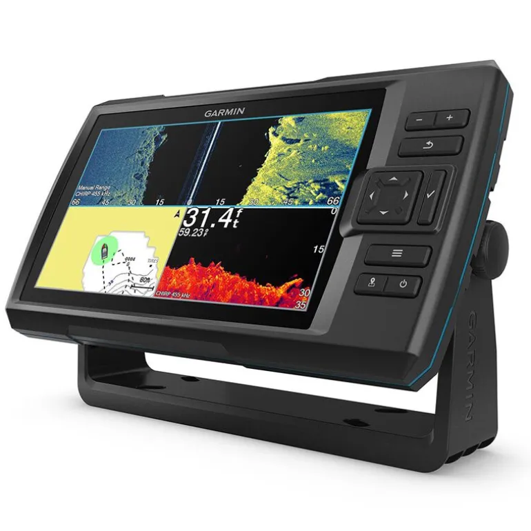 Dans la boite : STRIKER Vivid 9sv – Sonde GT52HW-TM – Câble d’alimentation/de données – Câble adaptateur 12 broches pour sonde double 4 broches – Étrier – pivotant – Matériel – Vignette Garmin – Documentation