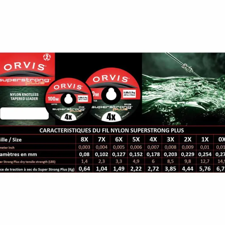 Le fil de pêche à la mouche Orvis Superstrong plus est celui qui présente les meilleurs performances de résistance au nœud et à l’abrasion pour une régularité de diamètre exceptionnelle. Passé aux rayons X les variations de diamètres sont imperceptibles, la résistance de ce fil Orvis est extrêmement régulière. La plupart des fils traités avec des Contrairement à de nombreux nylons, le fil Superstrong Plus est peu sensible à l’imprégnation de l’eau ce qui en améliore considérablement sa résistance au nœud.