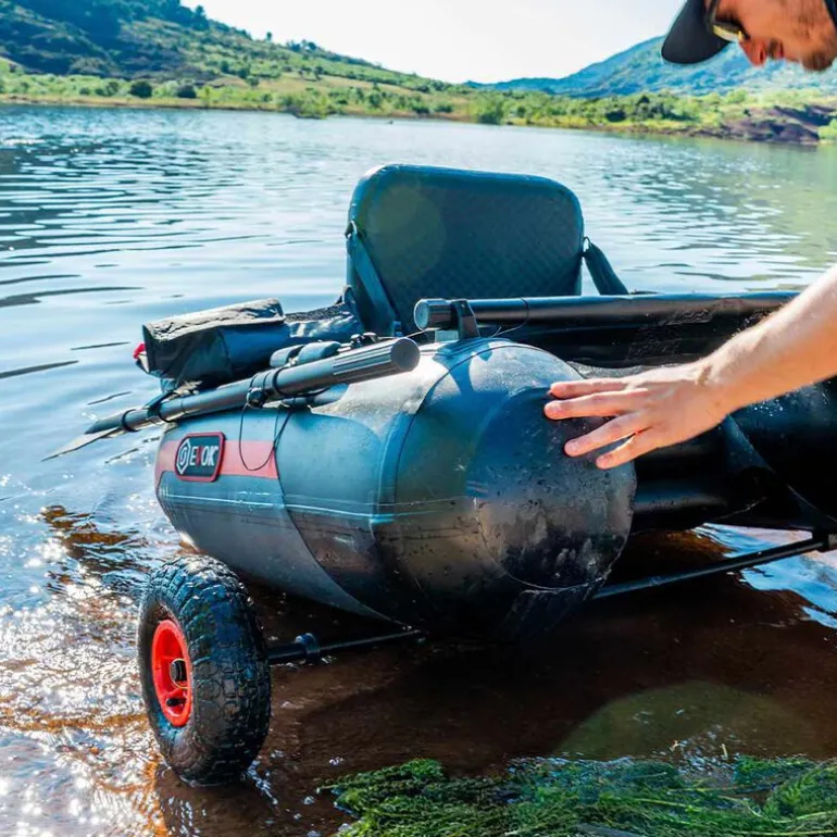 Pour faciliter vos déplacements, le FT 150 est équipé d’un « wheel kit », un système de fixation à roues qui permet de tirer votre float-tube jusqu’au point de mise à l’eau, évitant ainsi de le traîner ou de l’abîmer. Une fois arrivé à destination, il ne vous reste plus qu’à déployer vos équipements : deux poches latérales amovibles, une paire de rames robustes.