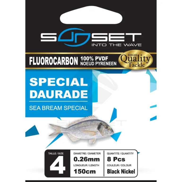 Les hameçons montés mer Sunset Rs Competition Special Daurade / Fluoro possèdent une empile de 1m50 en Fluorocarbone 100% PVDF munie d’une boucle pour une fixation rapide.