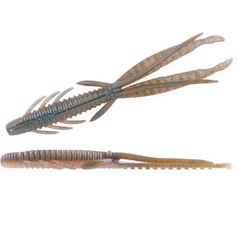 La DOLIVE SHRIMP est une créature imitant un petit Crustacé de type écrevisse ou langoustine. Elle possède un corps fuselé avec plusieurs appendices sensoriels qui s’animent différemment selon les techniques utilisées. Les pinces sont très fines, longues et plates, elles ondulent lors des twitchs et shaking (petits coups de sion dans la bannière) en drop shot ou sur le fond. À la descente, ses pattes latérales vibrent à haute fréquence ce qui le rend également efficace en pêche de type réaction dans les obstacles et les herbiers. Elle saura décider les poissons difficiles, Bass, Perches et Bars, c’est la créature finesse par excellence. La quantité de sel a été minimisée pour augmenter la solidité de la matière notamment sur les prédateurs marins.