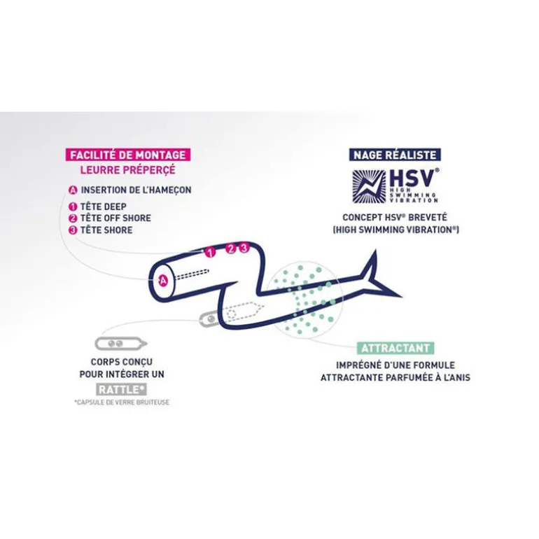 Ce leurre est pré-percé pour accueillir les 3 types de tête: shore, off shore et deep.
