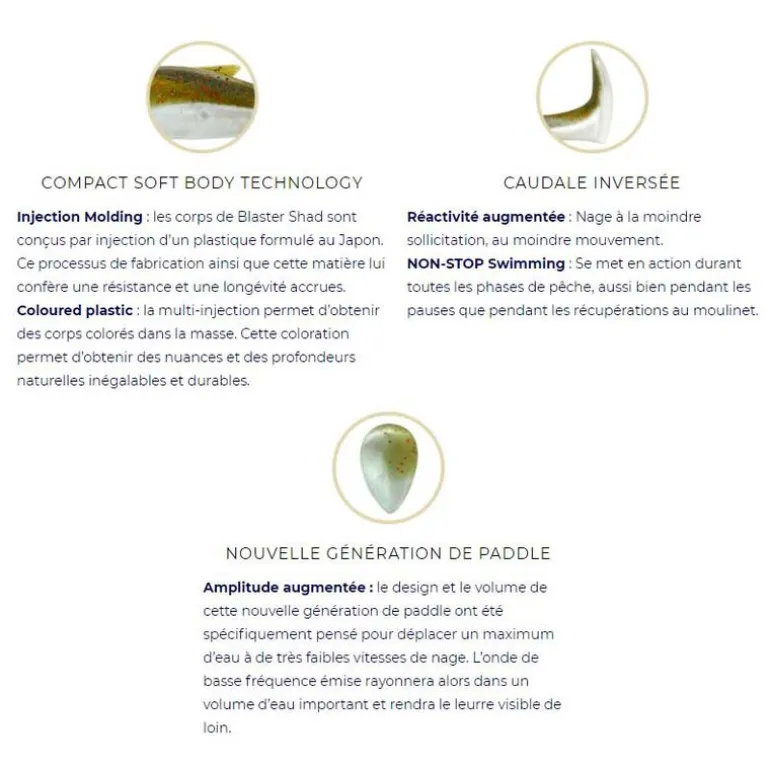 Injection Molding : les corps de Blaster Shad sont conçus par injection d’un plastique formulé au Japon. Ce processus de fabrication ainsi que cette matière lui confère une résistance et une longévité accrues.