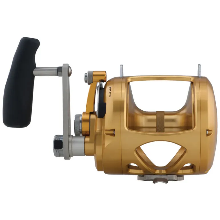 Le moulinet de traîne Penn International 16 VI VS série Gold possède un bâti et des flasques en métal qui lui assurent un alignement parfait des engrenages en cuivre, même lorsque le moulinet subit de très fortes tensions.