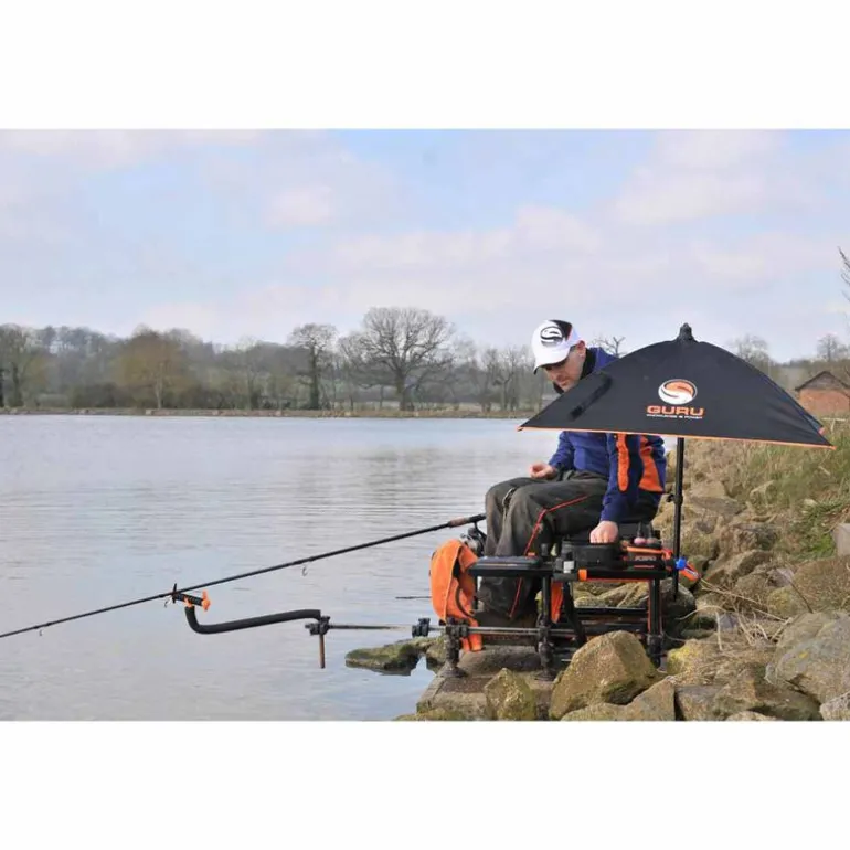 Le BAIT UMBRELLA est livré avec 2 pieds : un pied télescopique avec pique pour assurer un bon ancrage dans le sol + un pied droit pour fixation sur votre station de pêche / chaise feeder. Il est livré dans une housse de grande qualité aux couleur de GURU.