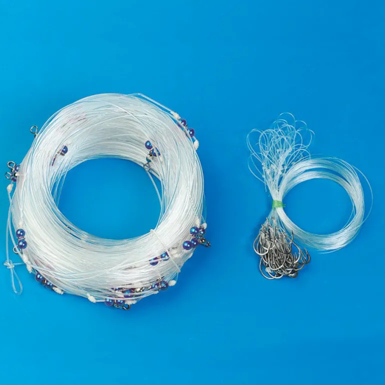 Les bas de lignes montés sur les émerillons font 60 cm de long, montés sur un nylon de diamètre 60/100, terminé par un hameçon n°2/0 en inox.