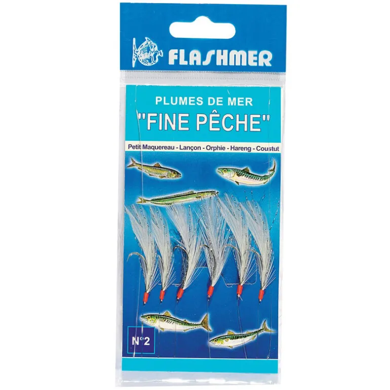 Montage de 6 hameçons N°4 sur Nylon 40/100 (longueur totale 155 cm) -Pêche des lisettes, petits chinchard, lançons, petites orphies, sardines, sprats, eperlans, vifs.. Les filaments torsadés blancs renforcent l’attractivité de la plume. Lestez le montage avec une cuiller Flashmer. Les effets flashants de la cuiller attireront les poissons de loin.