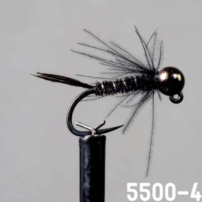 5500-4: Nymphe droite lourde et classée comme nymphe imitative. Montage inspirée de la célèbre «Black Pennel». Montage jig sur base noire et signaux argent complémenté d’une collerette pour donner plus de réalisme.
