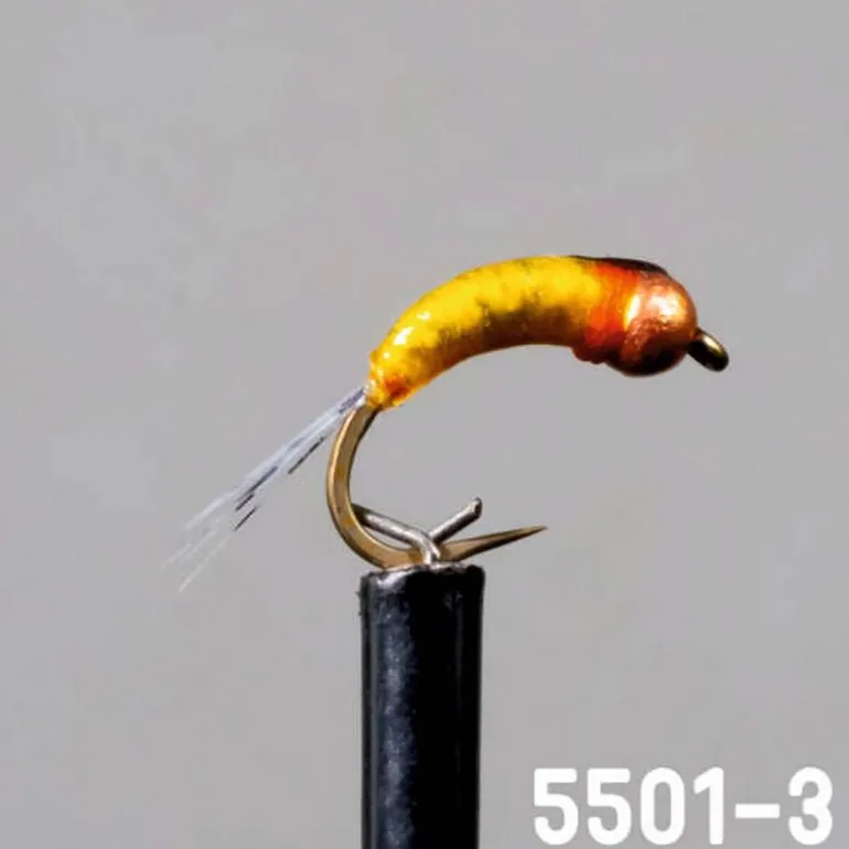 5501-3 : Nymphe courbée lourde et classée comme nymphe incitative. Montage perdigone en corps lisse coloris or avec cerques qui facilite l’immersion, complémenté d’un tag noir qui représente un sac alaire et atténue le signal de la bille. Bille en cuivre pour garder un aspect neutre. Rajout d’un hot spot (signal) orange sur la zone de thorax pour mettre en évidence l’imitation.