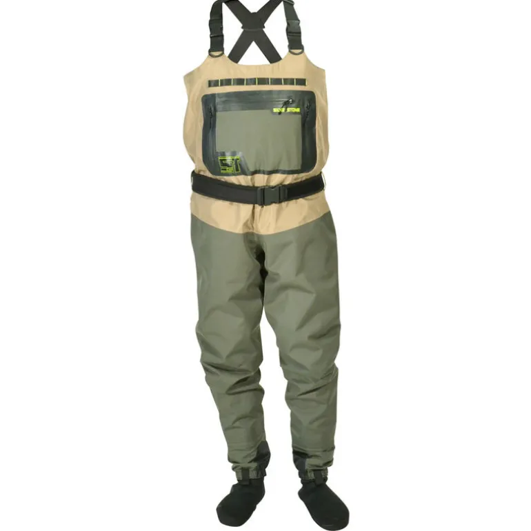 Sa partie basse est construite à partir d’un tissu 5 couches jusqu’à la taille ce qui autorise une utilisation intensive dans les endroits les plus encombrés. Des guêtres intégrées sont prévues pour bien recouvrir le haut des chaussures afin d’empêcher l’intrusions de sable ou de graviers. Les chaussons en néoprène sont confortables et s’insèrent bien dans les chaussures.