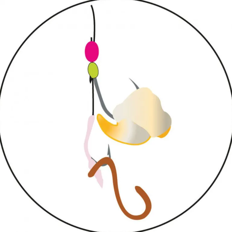 Ce bas de ligne a la particularité d’avoir un petit hameçon monté juste en dessous de l’hameçon principal, afin de déjouer la méfiance des poissons les plus tatillon.