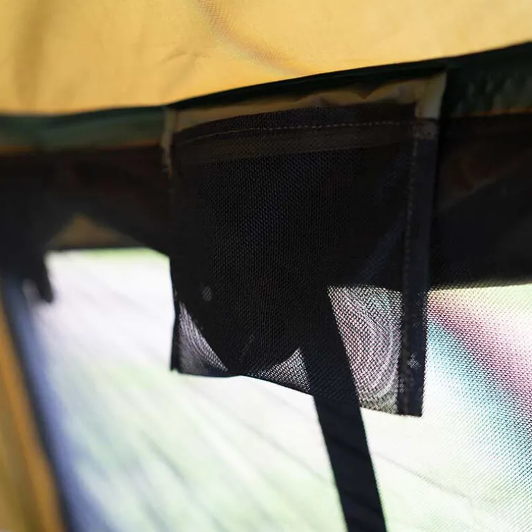 Sa toile étanche et respirante avec une tête hydrostatique 10 000 mm assure une excellente résistance à la pluie tout en limitant la condensation. La structure repose sur des mâts aluminium haute résistance de 16 mm, complétés par un système d’articulation Spider Lock garantissant une mise en place rapide et une grande stabilité.