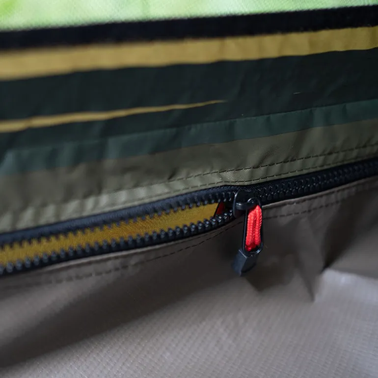 Côté équipement, on retrouve une porte modulable (ouverture par le bas ou en mode boîte aux lettres), des fenêtres moustiquaires (latérales et arrière) avec fermeture zip + velcro, ainsi qu’un tapis de sol heavy duty en une seule pièce, fixé par des fermetures éclair haute résistance pour une parfaite étanchéité. Les détails pensés pour la pêche moderne sont bien présents : supports cannes velcro, élastiques de tension, anneaux métalliques, œillets pour lampe, et sardines vrilles renforcées.