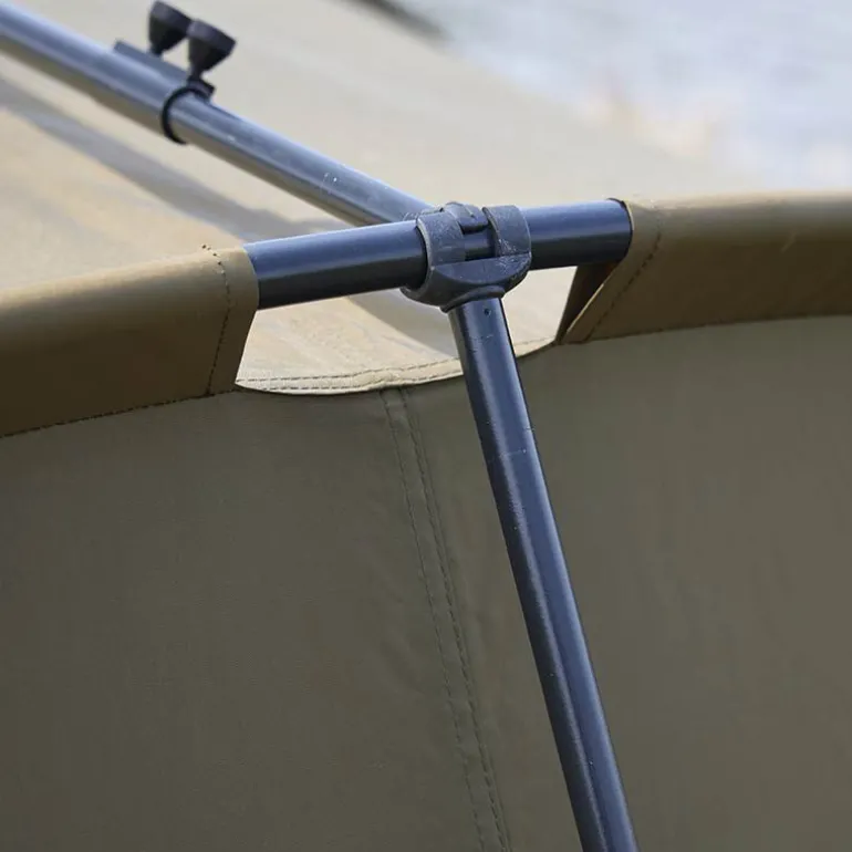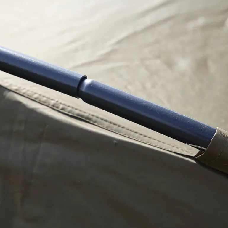 Sa structure repose sur des mâts aluminium haute résistance Ø19 mm en 5 sections, complétés par 3 raidisseurs télescopiques Ø19 mm avec double vis de serrage, garantissant une excellente rigidité et une très bonne tenue au vent. Les finitions renforcées (doubles coutures contre-soudées, zips renforcés, support de casquette renforcé) augmentent la durabilité, tandis que le tapis de sol heavy duty en une seule pièce protège efficacement de l’humidité.