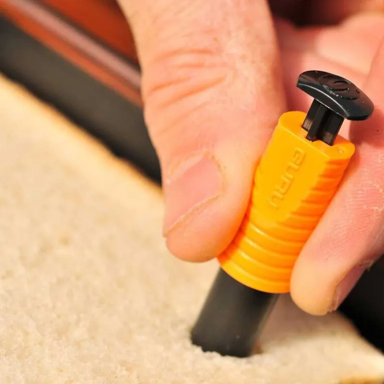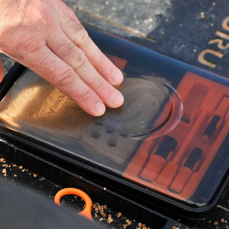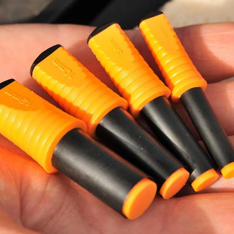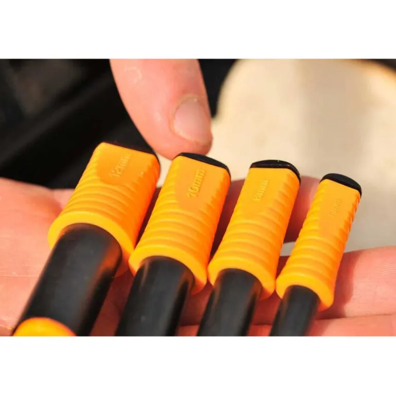 GURU a également travaillé sur le design de ce couvercle. Le but est de garder vos appâts en parfaite condition par temps pluvieux. Le couvercle est aussi teinté pour éviter que vos appâts ne se dessèchent sous les rayons du soleil. Lorsque vous ouvrez le couvercle, il se bloque à la hauteur de vos appâts. Si toutefois vous l’ouvrez entièrement, vous accédez au quatre emporte-pièces en acier inoxydable. Ils sont déclinés en 4 tailles de 6 mm, 8 mm, 10 mm et 12 mm qui couvrent de nombreuses situations de pêche, et vous permettent de « puncher » des appâts comme le pain, la viande ou encore les bouillettes. En déclipsant l’emporte-pièce, aussi appelé perforateur à poussoir, vous allez obtenir un objet compact et très pratique à utiliser : lorsque vous enfoncez l’emporte-pièce dans l’appât, le poussoir remonte, et en le pressant vous libérerez l’appât. Tous les emporte-pièces sont très tranchants, de façon à pouvoir perforer des appâts plus durs comme des bouillettes, du pâté dur ou de la saucisse : la coupure sera toujours parfaite et propre !