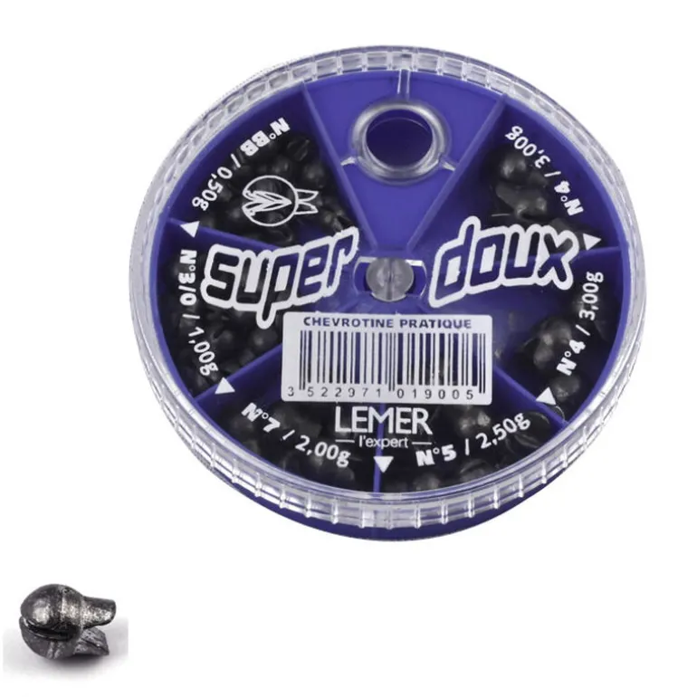 Boite distributrice 5 cases contenant un assortiment de chevrotines pratiques de : 0.5g diamètre N°BB 1.0g diamètre N°3/0 2.0g diamètre N°7 2.5g diamètre N°5 3.0g diamètre N°4.