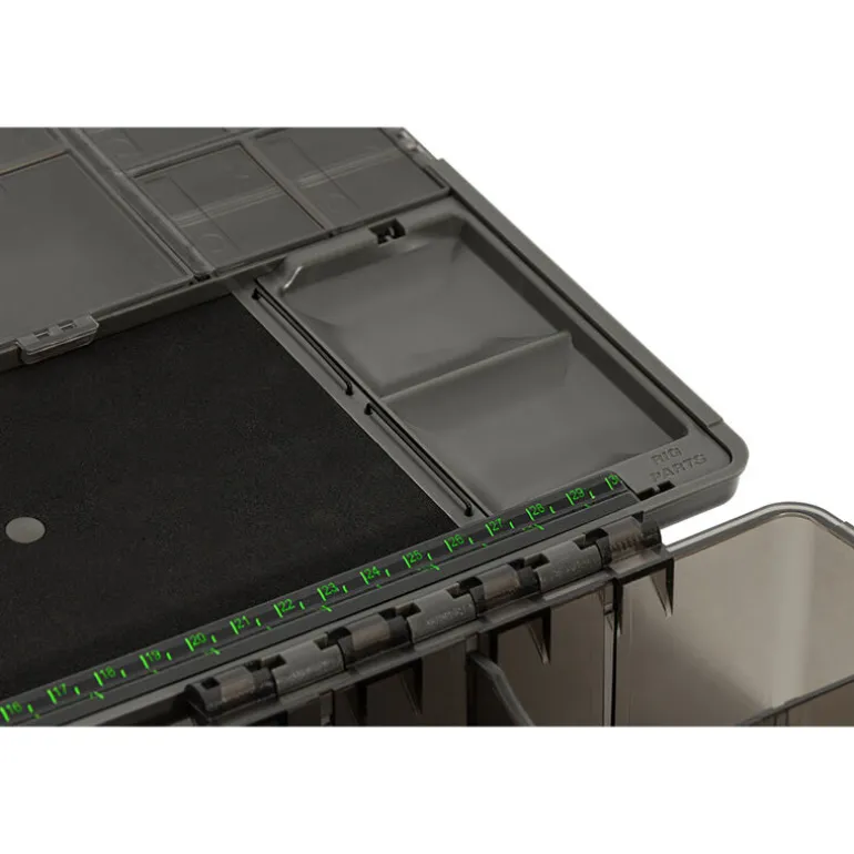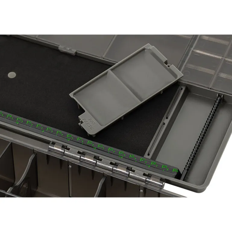 Le couvercle intègre 25 compartiments individuels avec couvercles transparents, idéals pour organiser émerillons, perles, gaines, Heli-Safes, etc. Une rig board intégrée permet de stocker jusqu’à 56 bas de ligne montés, avec un système de barres rainurées et fourni avec 30 épingles simples et 20 doubles. Elle dispose aussi d’un rig bar spécial Spinner Booms, d’une règle hi-vis gravée pour mesurer vos montages, et même d’un petit compartiment amovible pour garder vos composants à portée de main lors du montage.