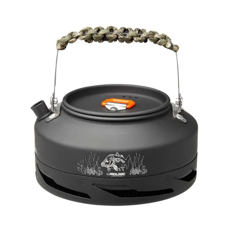 Un bouilloire avec une poignée recouvert de corde afin de ne pas se bruler, un couvercle et un super motif de carpe sur le coté.