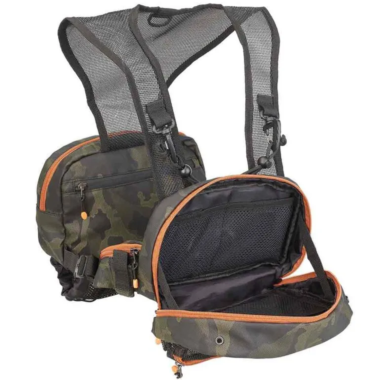 Le chestpack inclut une pochette pour bobines avec sortie frontale, des séparateurs amovibles pour organiser son matériel selon ses besoins, ainsi qu’une mousse de stockage dédiée aux nymphes, mouches et hameçons. Son compartiment avant aéré permet de visualiser facilement le contenu tout en laissant sécher les éléments humides. On retrouve également trois mini poches frontales en maille caoutchoutée pour un rangement rapide et visible.