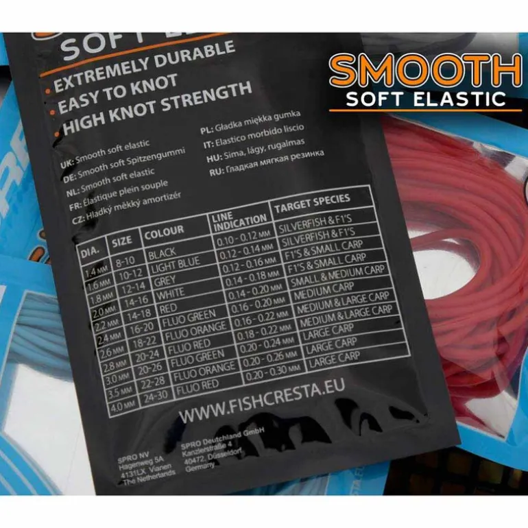 Smooth est un élastique plein qui rassemble les meilleures caractéristiques d’un élastique plein et d’un élastique creux. Il est très souple et son étirement rappelle immédiatement celui d’un élastique creux, mais dans un plus petit diamètre. Smooth peut se monter facilement sur n’importe quel type de bung, stopper ou connecteur. De plus, cet élastique est très souple mais conserve toutefois sa robustesse. Il possède aussi une bonne résistance à l’usure permettant ainsi de pouvoir tout aussi bien l’utiliser de manière intensive sur un kit puller ou sur un kit classique. Il est disponible dans 13 tailles différentes facilement reconnaissables grâce à leur couleur. Cette gamme permet de couvrir toutes les pêches de poissons blancs et de carpes à la canne.