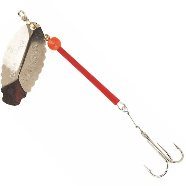 Une référence pour la pêche du carnassier à la cuillière la Suissex Loire Argent dispose d’une palette argenté avec une tache noir dessus et d’une gaine rouge sur le corp imitant ainsi un gardon génère beaucoup d’attaque de carnassier.