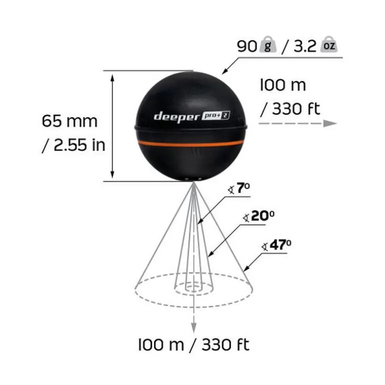 3 FRÉQUENCES DE FAISCEAU :Faisceau grand angle de 47° (100 kHz), faisceau moyen de 20° (240 kHz) et faisceau restreint de 7° (675 kHz). Mieux pour la pêche sur glace et en bateau.
