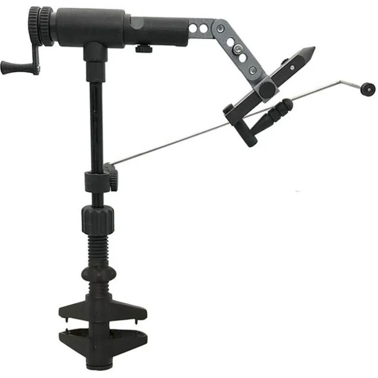 Étau entièrement rotatif, monté sur roulements à billes. L’ossature de l’étau est en carbone et les parties fonctionnelles en acier. La tension de la rotation est réglable. Tous les étaux Danica disposent d’un pied à serrage rapide et un guide-fil.