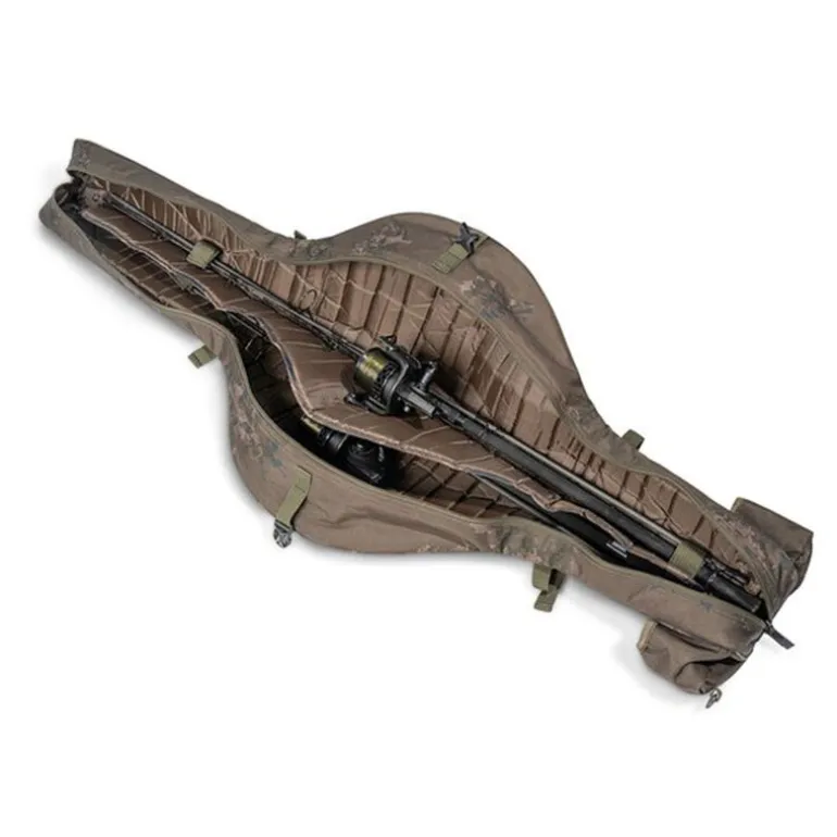 La pochette extérieure à la base du fourreau et les sangles de compression permettent de transporter des sacs de conservation, des mâts tempête, des lances bouillettes ou même des abris compacts à l’extérieur du fourreau.