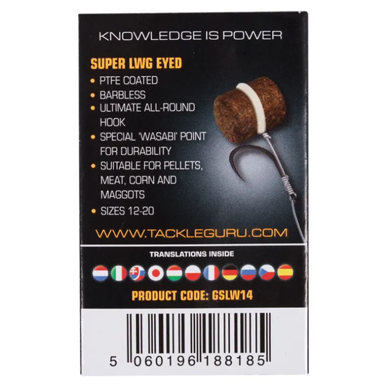 L’hameçon sans ardillon SUPER LWG de GURU est un hameçon à oeillet solide et polyvalent qui s’adapte parfaitement à la pêche au flotteur ou au feeder, notamment lorsque l’on utilise un nœud sans nœud. Cet hameçon est équipé de la fameuse pointe « Wasabi », très durable et particulièrement piquante. Il est recouvert d’un revêtement PTFE qui préserve le piquant et qui lui assure une grande longévité. Sa forme déterminée avec beaucoup de soin en fait un hameçon parfait pour la présentation de pellets, de viande, de maïs doux, de vers ou d’asticots…