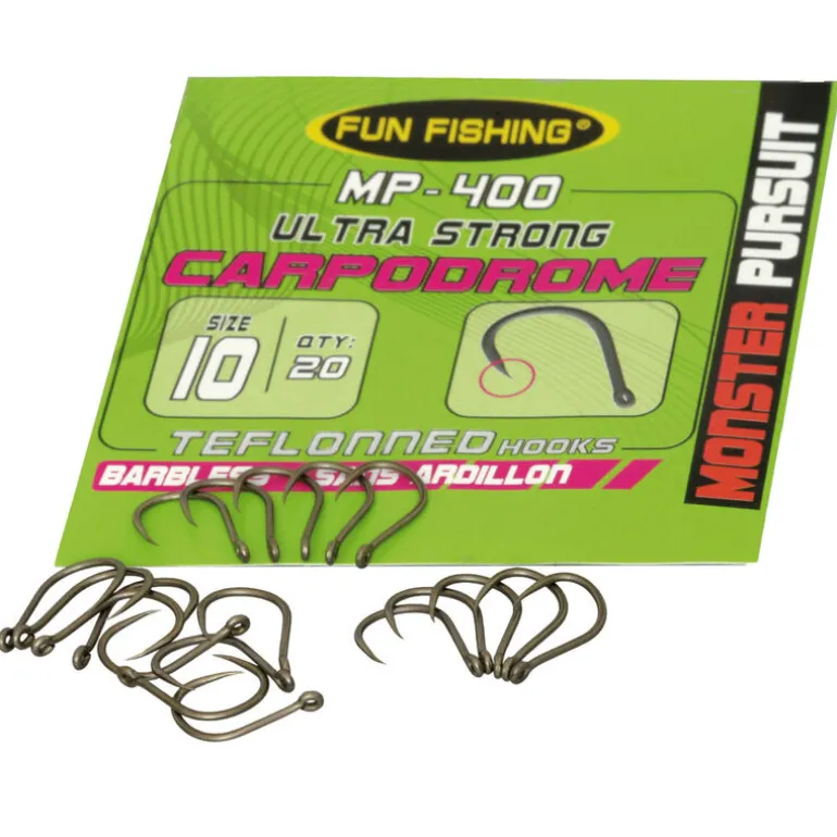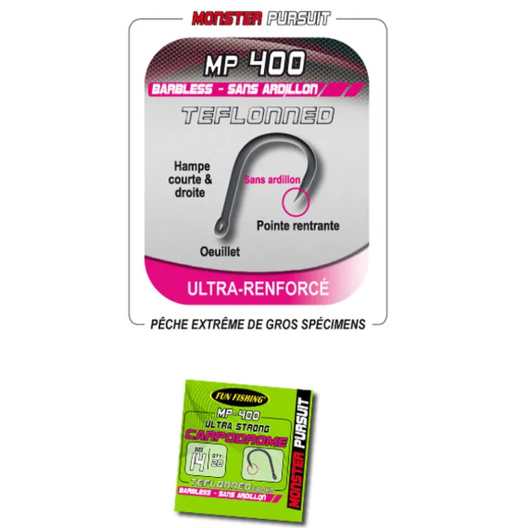 Conditionnés en sachet de 20, les hameçons à œillet sans ardillon MP400 sont disponibles en 6 tailles différentes : n°6, n°8, n°10, n°12, n°14 et n°16.