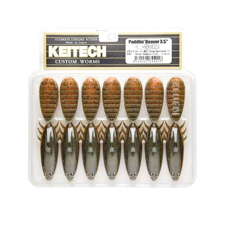 Le Paddlin’ Beaver est un leurre souple dont l’originalité réside dans la conception de son paddle. Ce dernier étant large et de masse significa – tive, il déplace beaucoup d’eau et reste attractif même à la descente. La jonction entre la queue et le corps a été amincie à son maximum et pla – cée sur le haut du leurre afin de rendre le tout extrêmement mobile, tant verticalement avec une action haut-bas