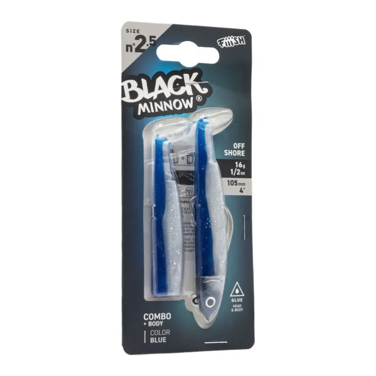 Le corps en plastique extra souple du Black Minnow® associé aux têtes plombées «off-shore» et BM «shore» lui donnent une vibration et une nage des plus naturelles. L’hameçon articulé Krog ajoute plus de mobilité au leurre. Sa queue transparente et ses couleurs renforcent son mimétisme…