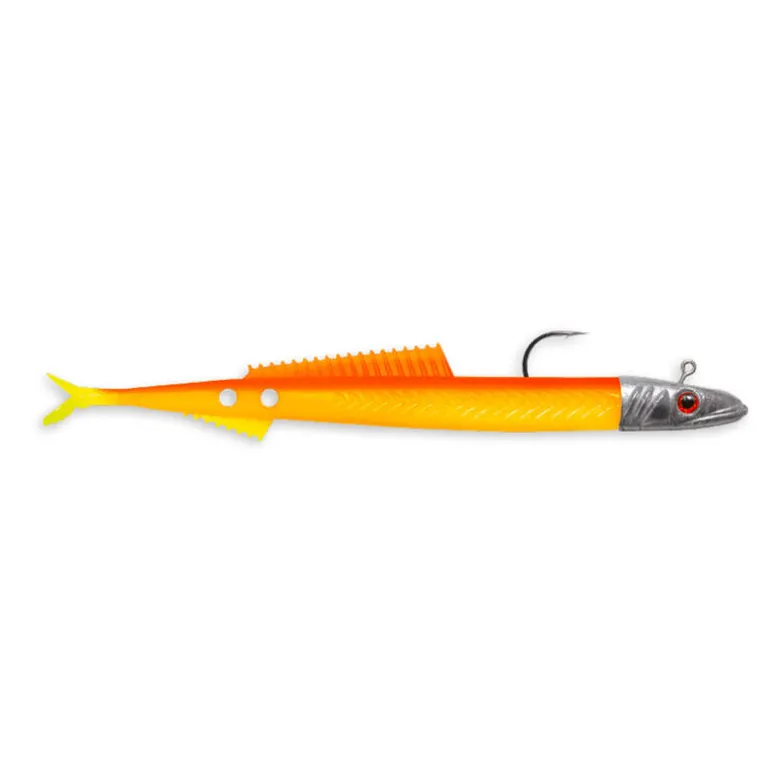 Le look a été spécialement travaillé afin d’essayer de se rapprocher au maximum de la nourriture des prédateurs recherchée en mer comme le lançon ou l’orphie. Le corps de ce leurre comporte de nombreuses stries donnant un aspect visuel de mouvement auprès des poissons prédateurs mais cela va permettre aussi d’y contenir de l’attractant.