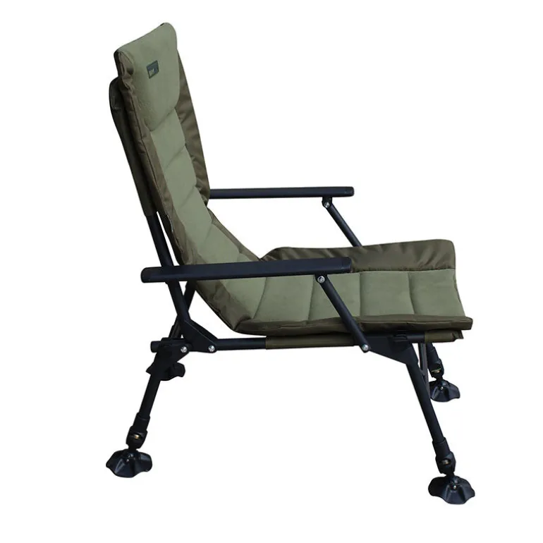 Grâce à ses pieds réglables avec patins boue orientables, il s’adapte facilement aux terrains irréguliers. Son système Lock-Out sur les 4 pieds améliore la stabilité, et ses accoudoirs confortables en font un fauteuil idéal pour se détendre au bord de l’eau.