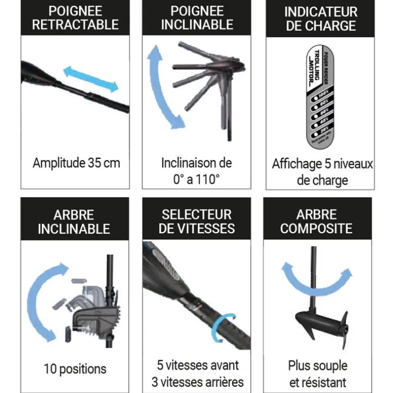 Construit à partir de matériaux composites de qualité voici un moteur résistant aux chocs et à la rouille. Grâce à son arbre inclinable et poignée rétractable et inclinable, il pourra se positionner à votre convenance dans votre embarcation, pour vous procurerez un excellent confort que ce soit en pêche ou en navigation.