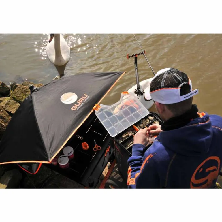Le BAIT UMBRELLA est livré avec 2 pieds : un pied télescopique avec pique pour assurer un bon ancrage dans le sol + un pied droit pour fixation sur votre station de pêche / chaise feeder. Il est livré dans une housse de grande qualité aux couleur de GURU.