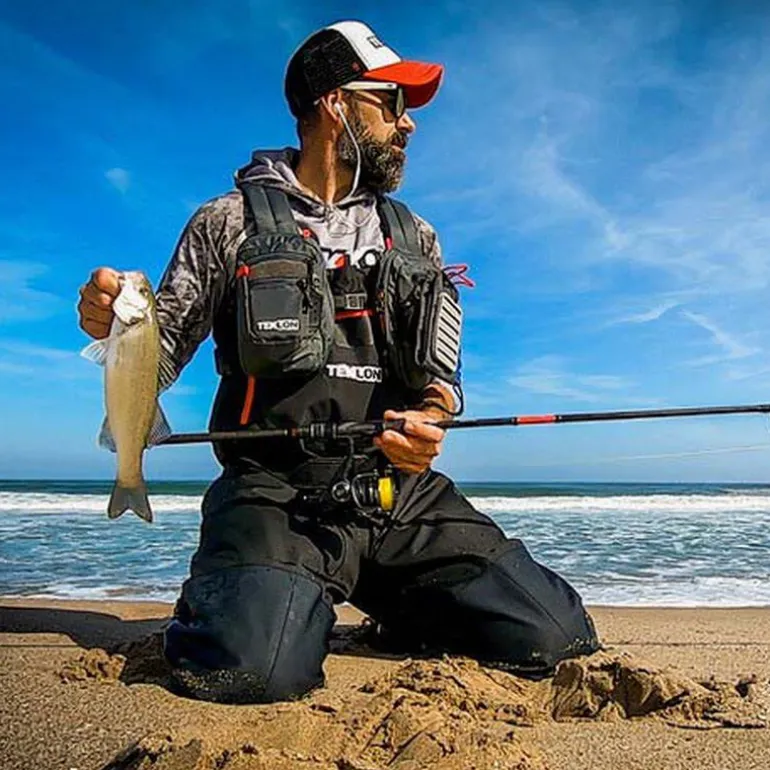 Munis d’une poche arrière idéale pour les grandes boîtes et accessoires. Il comprend di-fférentes boucles pour accrocher des accessoi-res, et un rétractor pour l’épuisette ou pour y accrocher le gilet lorsqu’il n’est pas utilisé.