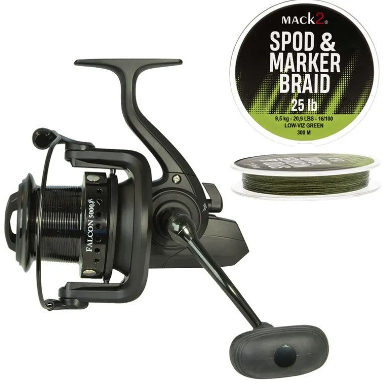 Dans ce pack vous trouverez le moulinet Falcon 5000 Spod and marker vraiment spécifiquement conçu pour être utilisé de façon intensive lors de scéance de spod ainsi qu’une bobine de tresse en 0.16m pour pouvoir atteindre de bonne distance de lancer et aussi si vous gratter avec bien sentir tous ce que le plomb rencontrera au fond.