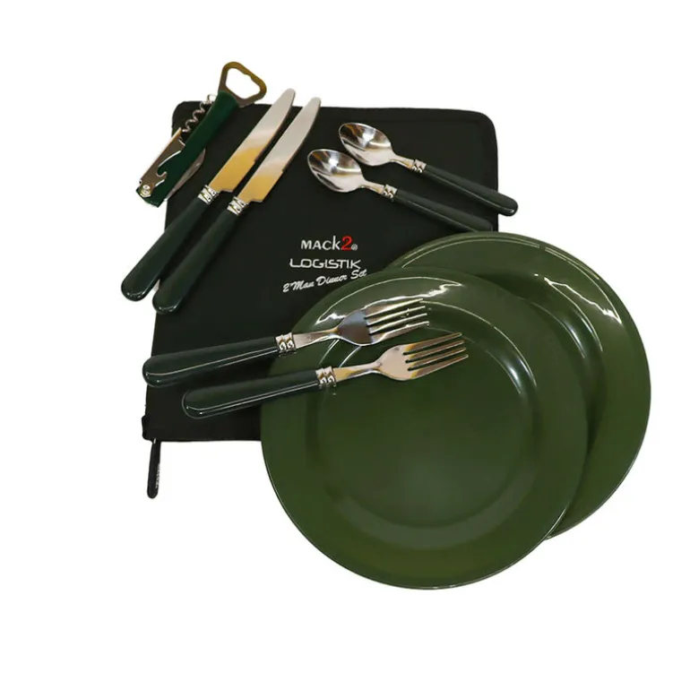 Le Logistik 2 man Dinner Set est un set pour 2 personnes comprenant assiettes, couteau, fourchette, cuillère et un limondier.