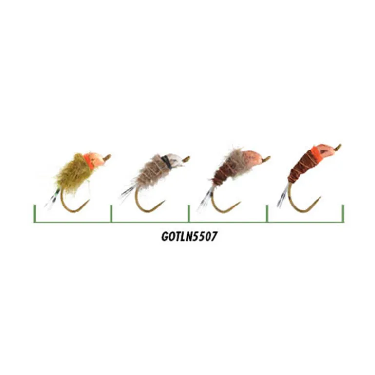 Le coffret comprend 4 nymphes différentes, sélectionnées pour compléter toutes les situations rencontrées au bord de l’eau. Elles peuvent être utilisées individuellement ou en tandem, selon le comportement des poissons et la technique employée.